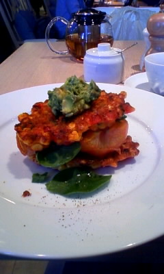 スイートコーンをメインにパプリカや玉ねぎを刻んだのと一緒に炒めてパンケーキ状にしたものの上にアボカドのディップが乗っております^v^うまうまなのです。これ大好きなのだ……**間にあったかいトマトとくるりと巻かれたベーコンも入っている。うまいのだ**
